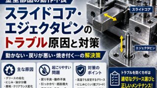 @金型メンテナンス 【金型部品の動作不良】スライドコア・エジェクタピンのトラブル原因と対策 スライドコア・エジェクタピンのトラブル原因と対策金型で発生するトラブルの中でも多いのが、スライドコアやエジェクタピンの動作不良です。・戻りが悪い・動きが渋い・途中で引っかかる・最悪の場合は焼き付きこうした症状は、製品不良だけでなく金型の損傷... 2026.04.27 NEWSお役立ち情報金型用グリース@金型メンテナンス